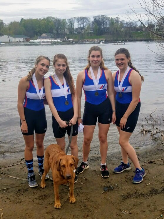 The Novice Women’s Quad celebrates their bronze medal finish with Coach Allgood’s regatta dog, Barley. From left to right: Kayla Heber (Wilton), Isabella DeSantis (Ridgefield), Josie Constantine (Stamford), and Lia Schlegel (Norwalk).